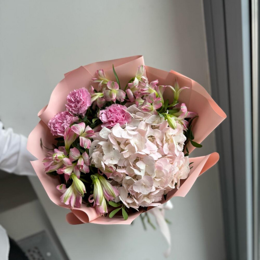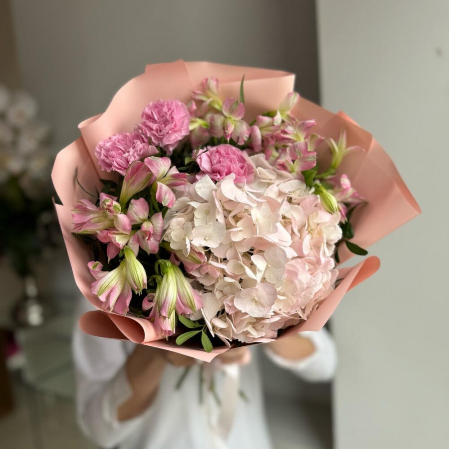 На фото букет «ванильный комплимент». В составе: гортензия 1 шт, альстромерия 4 шт, гвоздика 3 шт, писташ 3 шт, дизайнерская упаковка 1 шт, атласная лента 1 шт, . Все цветы свежие и ароматные, букет красиво оформлен и отлично подходит для подарка. Доступна доставка цветов или самовывоз.